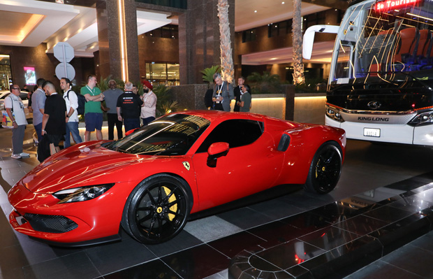 bus, led by a red Ferrari pace car, that would take them to the waiting Lotus