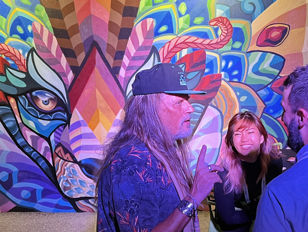 Peter Nein chatting with friends in front of one